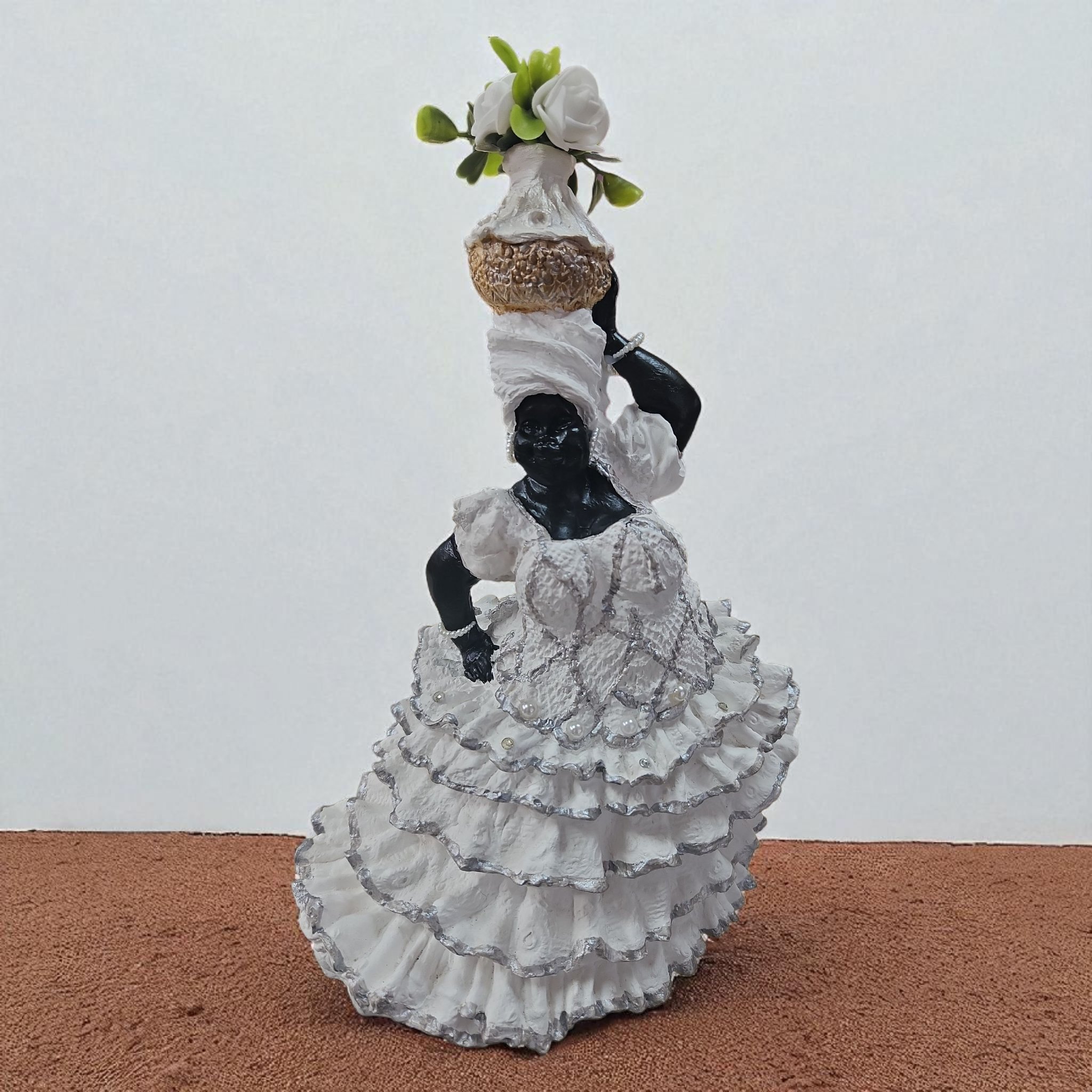 Imagem artesanal feita em gesso cerâmico de alta qualidade, pintada à mão. Representa uma baiana em trajes tradicionais brancos, com turbante e jarro de flores na cabeça, símbolo de oferenda, fartura e pureza espiritual.