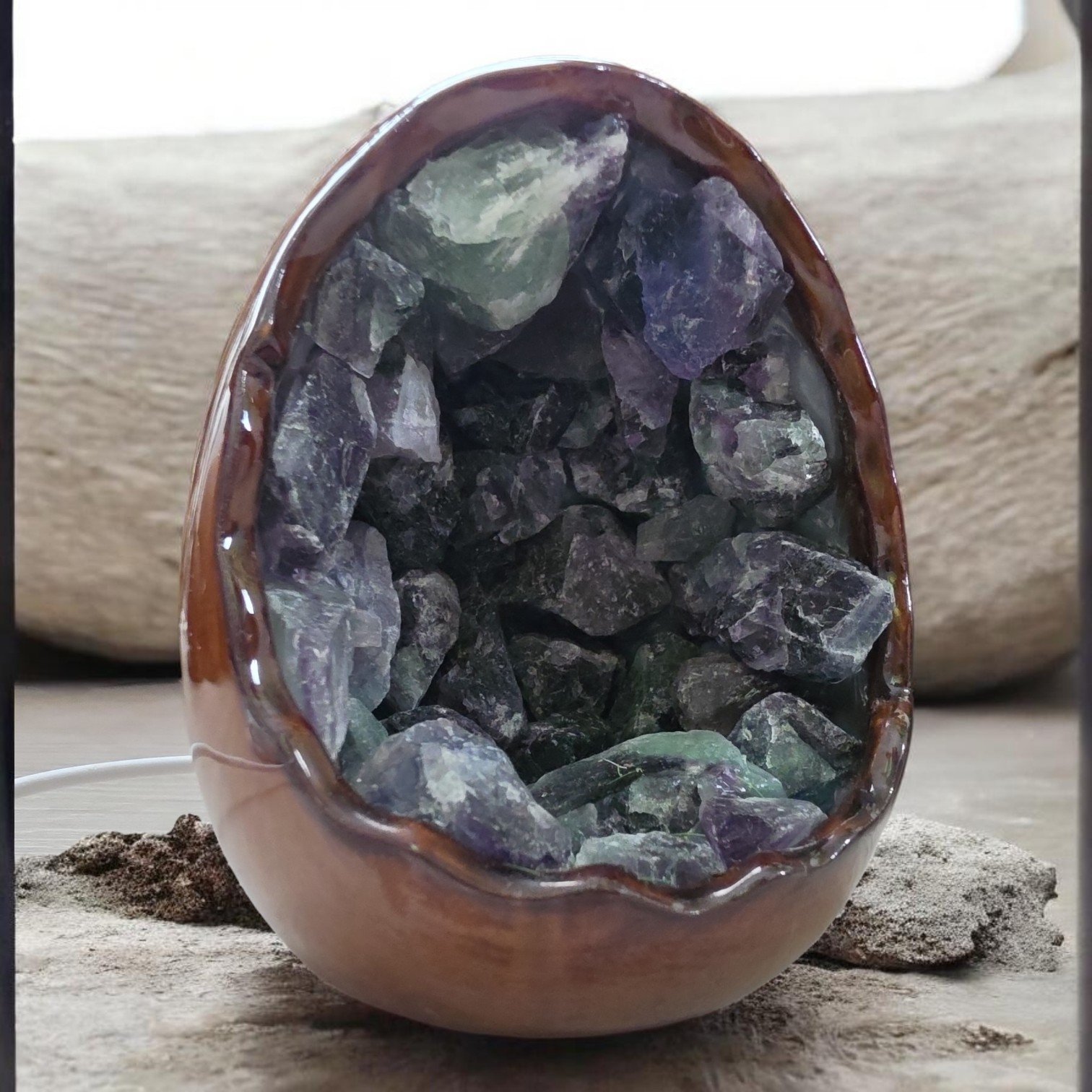 Este candeeiro em pedra natural de fluorite é uma peça única que une beleza e energia. Com tons que variam entre o verde e o roxo, a fluorite é conhecida por equilibrar a mente e trazer clareza nos momentos de dúvida.