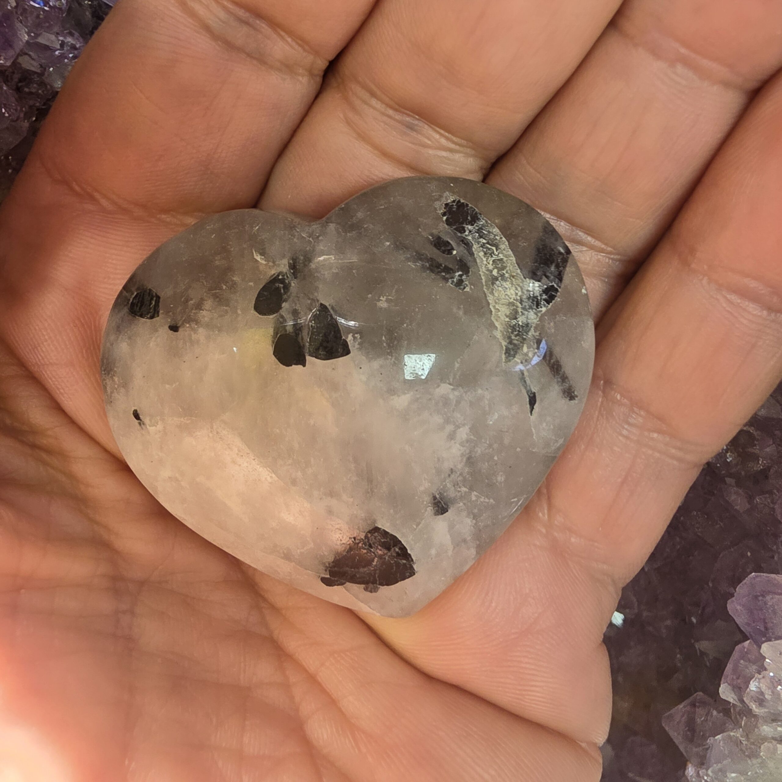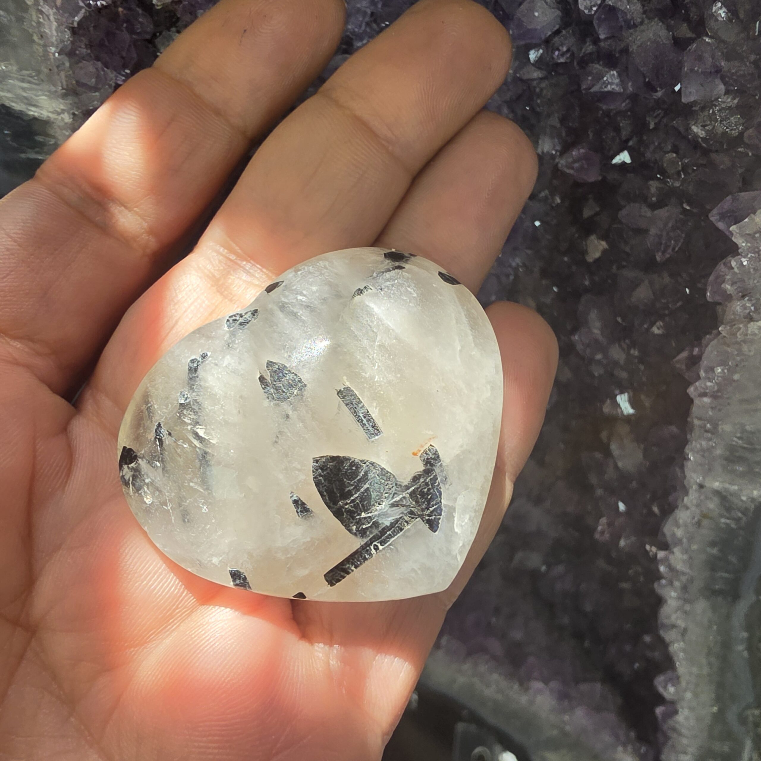 As inclusões escuras visíveis na pedra são fios de turmalina, conhecidos por absorver e neutralizar energias negativas, enquanto o quartzo amplifica essa ação.