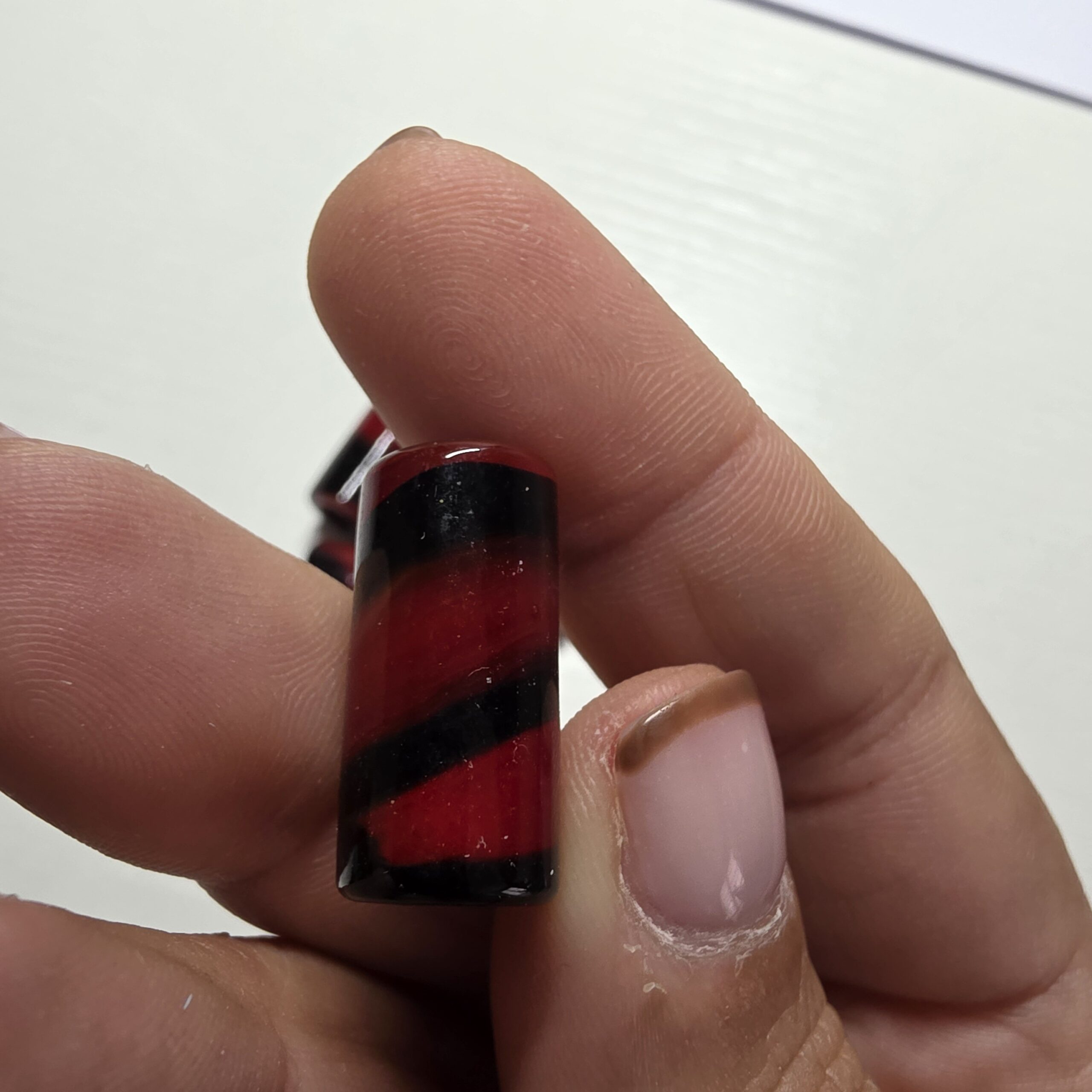 Pequena conta cilíndrica em resina/acrílico, na cor preta com detalhes em vermelho.