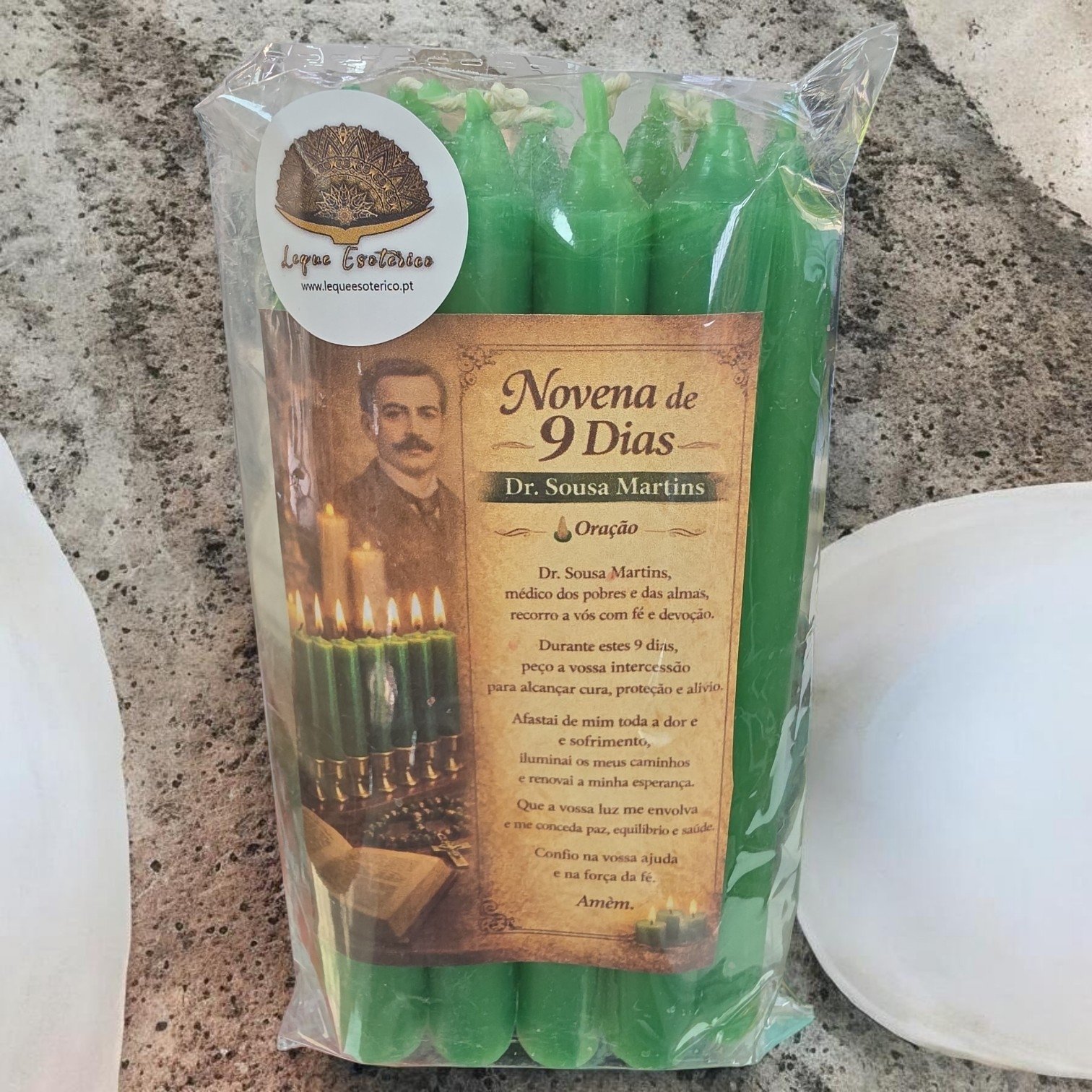 Este conjunto de 9 velas verdes foi preparado para a realização da Novena de 9 Dias ao Dr. Sousa Martins, uma das devoções mais procuradas para cura, proteção e alívio espiritual.