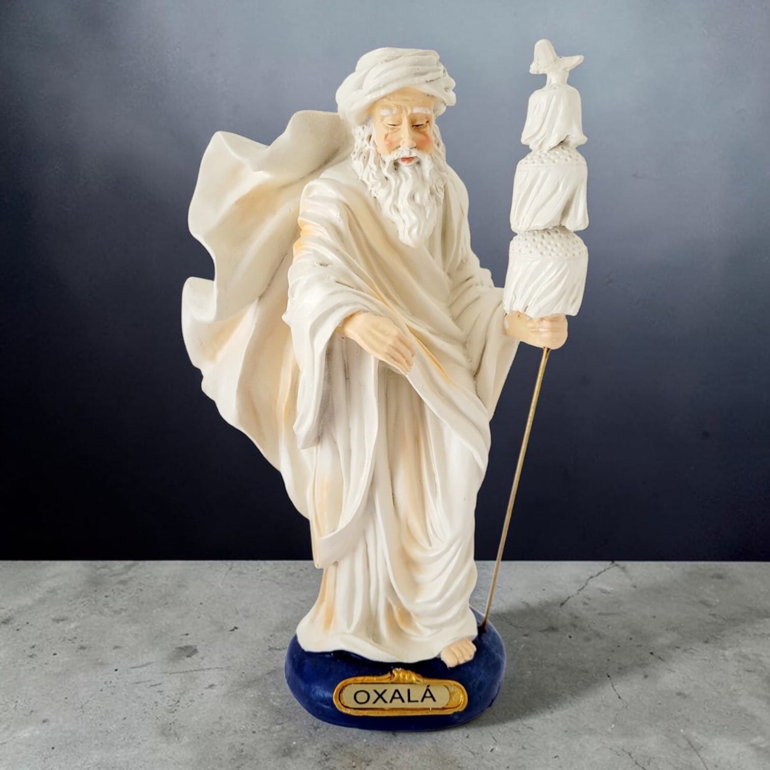 Imagem de Oxalá em Resina representa o Orixá da paz, da sabedoria e da criação. Com 20 cm de altura, esta peça minuciosamente trabalhada traz a serenidade e a energia pura de Oxalá, sendo ideal para altares, rituais e ambientes que buscam harmonia e equilíbrio espiritual.