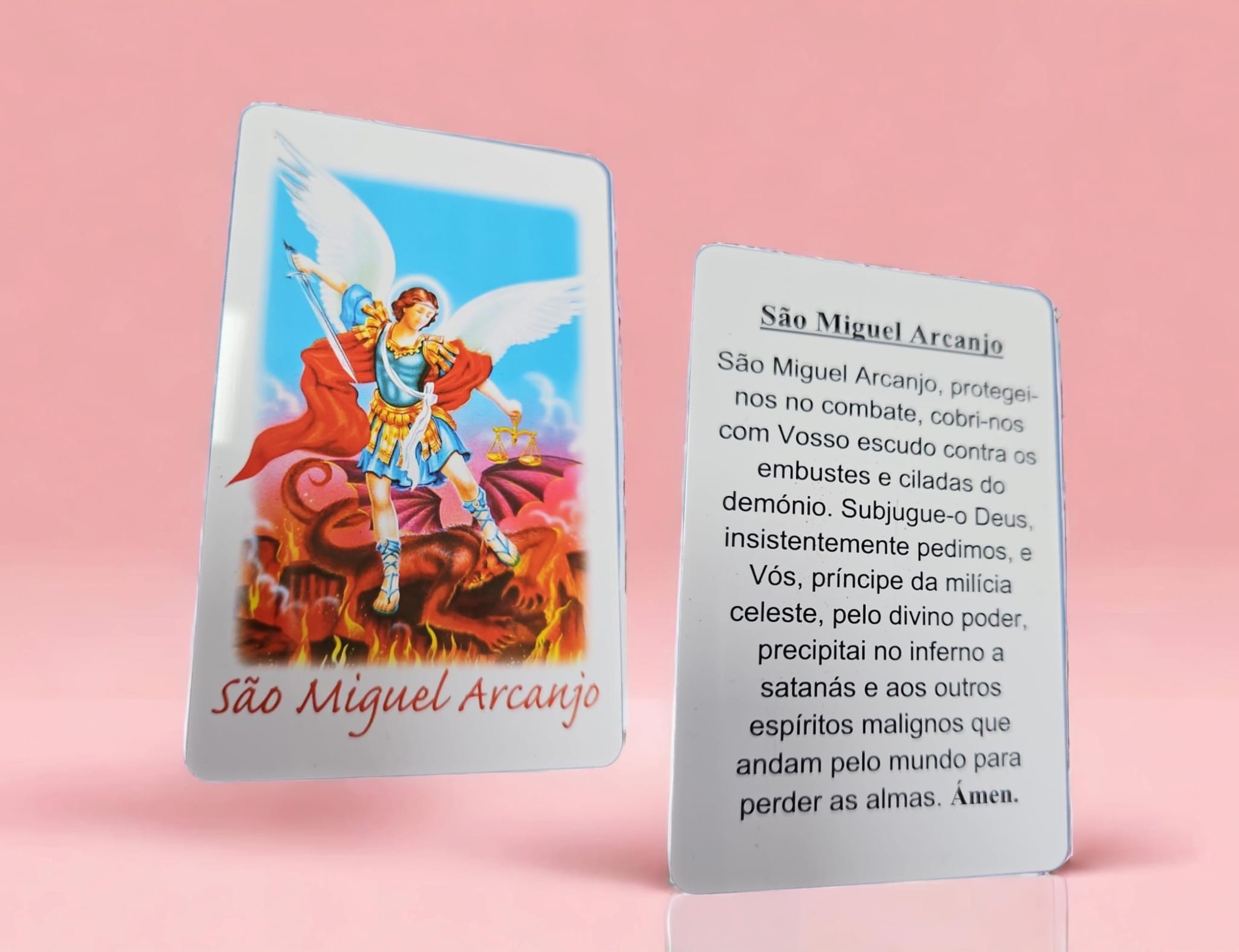 Geralmente, a pagela contém a Oração de São Miguel Arcanjo, muito conhecida e usada para afastar perigos espirituais e pedir sua intercessão.