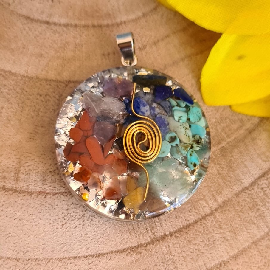 Este pendente tem uma variadade qualidade de pedras e no centro cobre para retirar a energia estagnada transmutando a energia para positiva, para além de fazer a limpeza também reduz os efeitos negativos dos campos electromagnéticos.