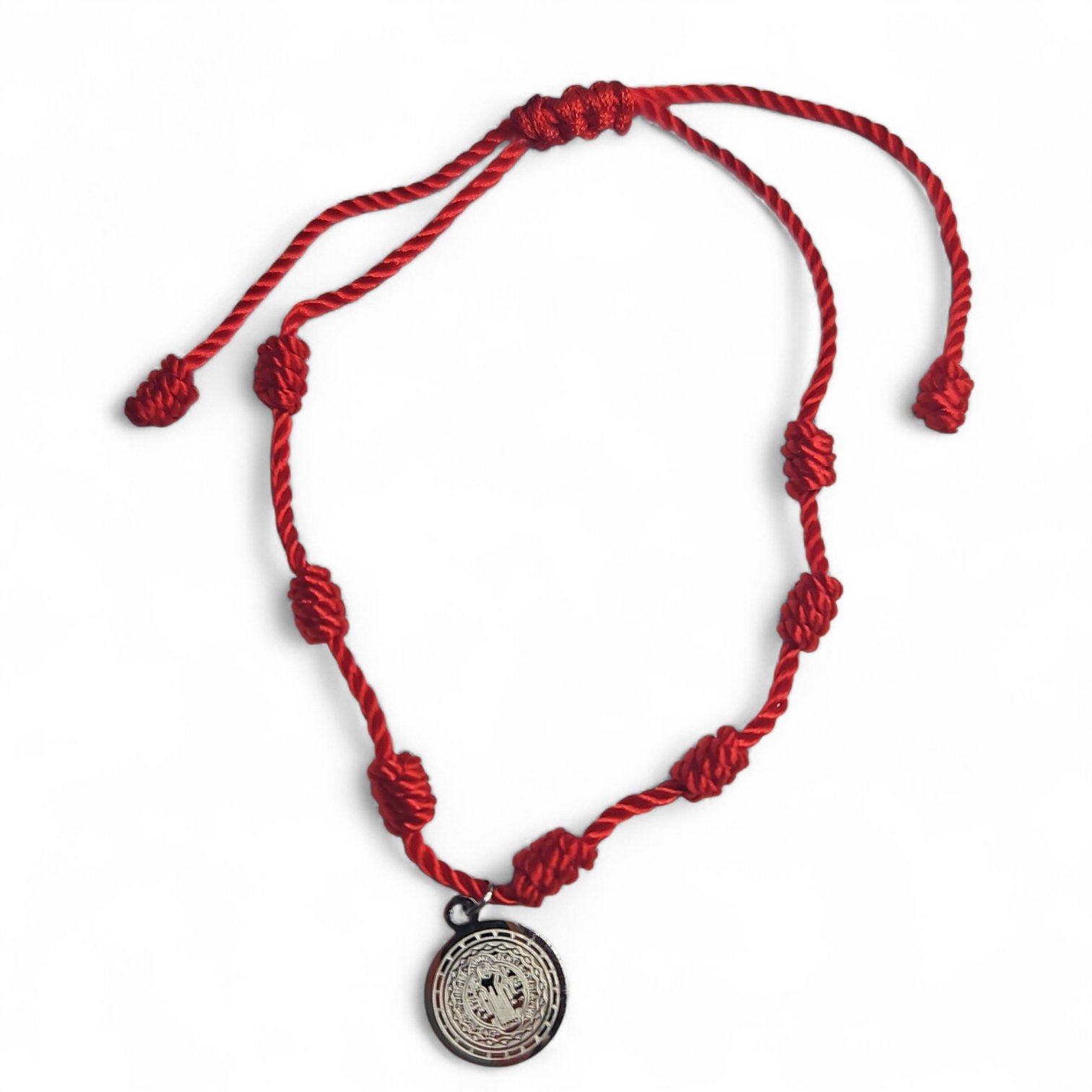 Pulseira de proteção espiritual feita em fio vermelho ajustável, com medalha de São Bento — um dos símbolos mais fortes de defesa contra energias negativas, inveja e más influências.