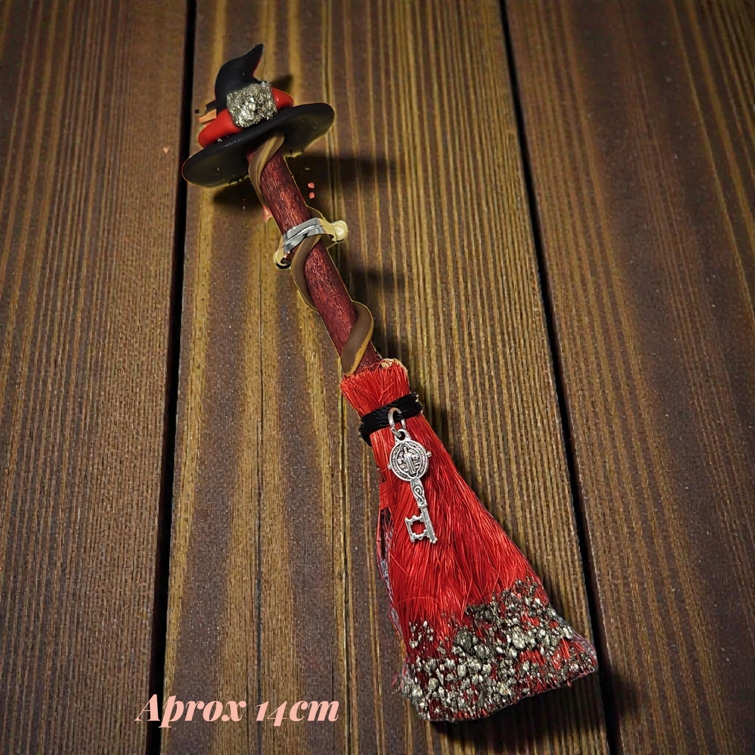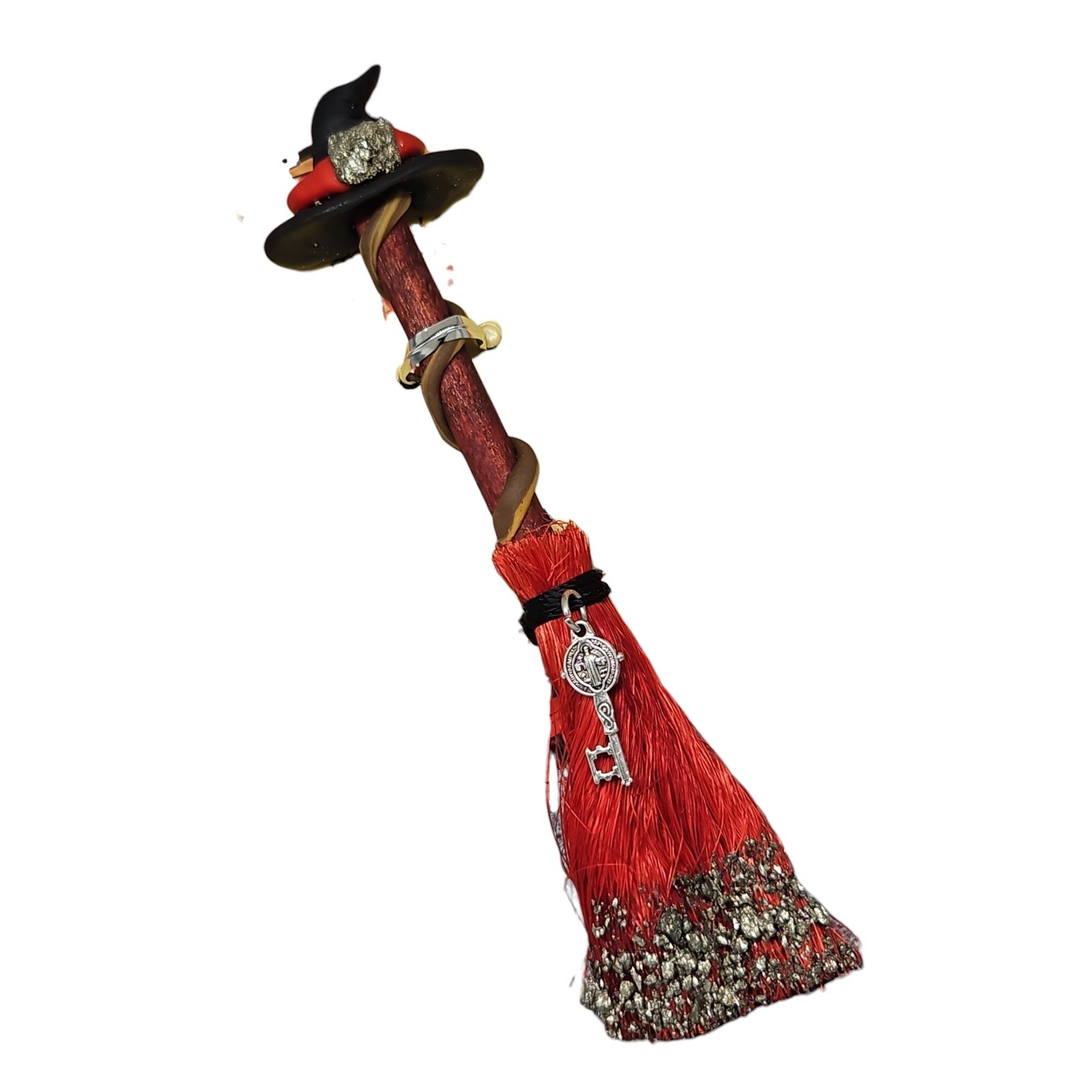 Contém pirita na ponta e no chapéu, pedra associada à abundância, sucesso e escudo energético, e o símbolo de São Bento, reconhecido mundialmente como um dos mais fortes símbolos de proteção contra energias negativas, inveja e ataques espirituais.